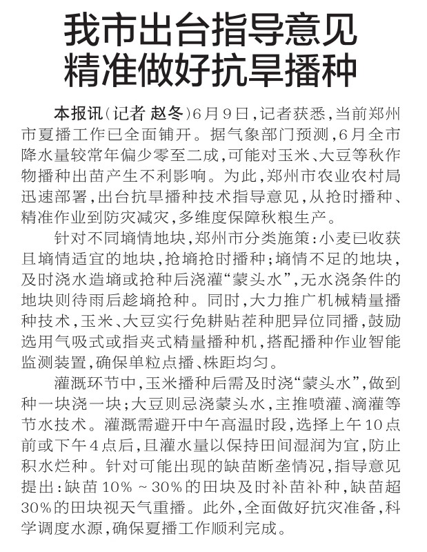 6月9日,记者获悉,当前郑州市夏播工作已全面铺开。据气象部门预测,6月全市降水量较常年偏少零至二成,可能对玉米、大豆等秋作物播种出苗产生不利影响。为此,郑州市农业农村局迅速部署,出台抗旱播种技术指导意见,从抢时播种、精准作业到防灾减灾,多维度保障秋粮生产。(今日《郑州日报》2版)