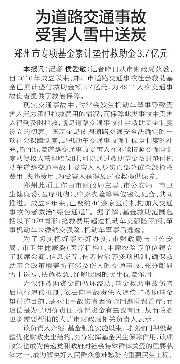 记者昨日从市财政局获悉,自2016年成立以来,郑州市道路交通事故社会救助基金已累计垫付救助金额3.7亿元,为4911人次交通事故伤者提供了救治保障。(今日《郑州日报》2版)