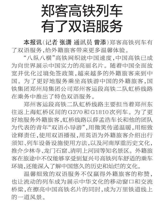 郑客高铁列车有了双语服务,给外籍旅客带来更多温馨体验。(今日《郑州日报》2版)