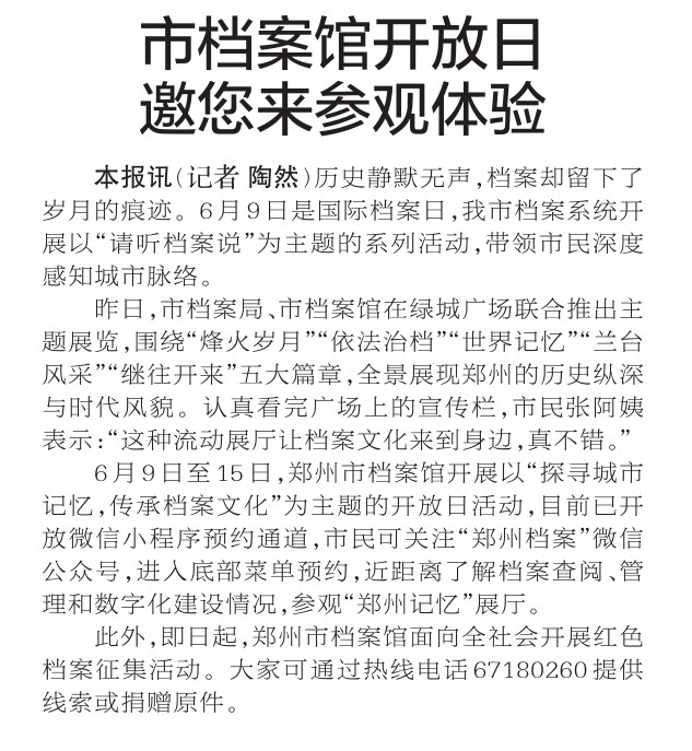 历史静默无声,档案却留下了岁月的痕迹。6月9日是国际档案日,我市档案系统开展以“请听档案说”为主题的系列活动,带领市民深度感知城市脉络。(今日《郑州日报》2版)