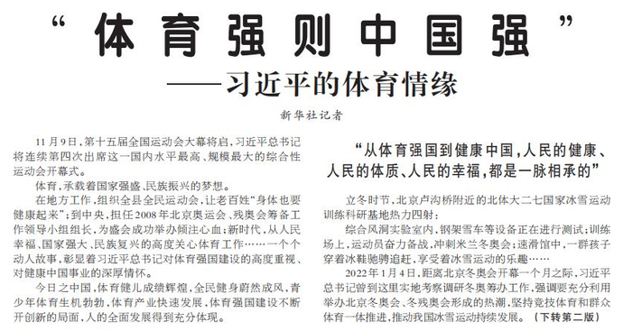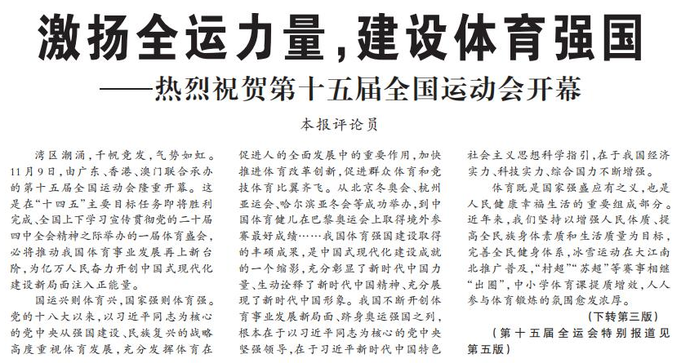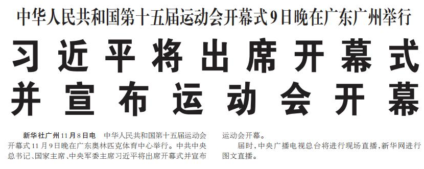 11月9日,第十五届全国运动会大幕将启,习近平总书记将连续第四次出席这一国内水平最高、规模最大的综合性运动会开幕式。(今日《人民日报》1版、2版)