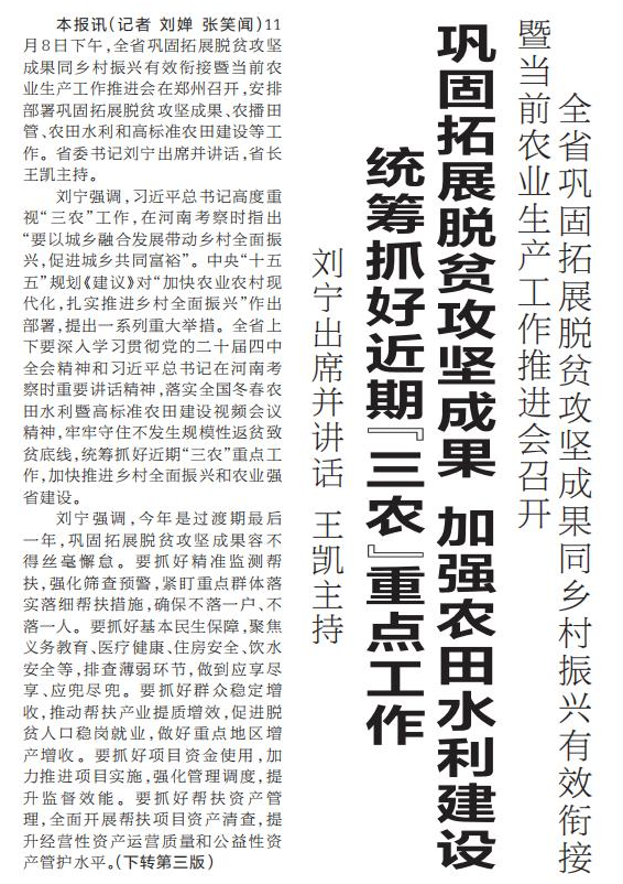 11月8日下午,全省巩固拓展脱贫攻坚成果同乡村振兴有效衔接暨当前农业生产工作推进会在郑州召开,安排部署巩固拓展脱贫攻坚成果、农播田管、农田水利和高标准农田建设等工作。省委书记刘宁出席并讲话,省长王凯主持。(今日《河南日报》1版、3版)