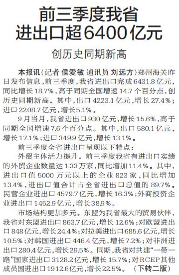 郑州海关昨日发布信息,前三季度,我省进出口完成6431.8亿元,同比增长18.7%,高于同期全国增速14.7个百分点,创历史同期新高。其中,出口4223.1亿元,增长27.4%;进口2208.7亿元,增长5.1%。(今日《郑州日报》1版)