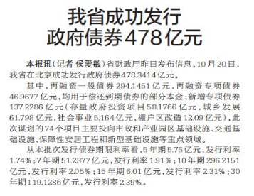 省财政厅昨日发布信息,10月20日,我省在北京成功发行政府债券478.3414亿元。(今日《郑州日报》2版)