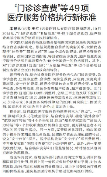 记者昨日从省医疗保障局获悉,10月20日起,“门诊诊查费”“B超检查”等49个综合诊查类、超声检查类医疗服务价格项目执行新标准。(今日《郑州日报》2版)
