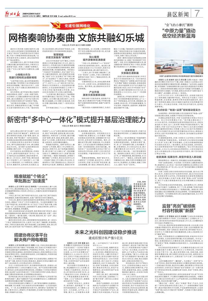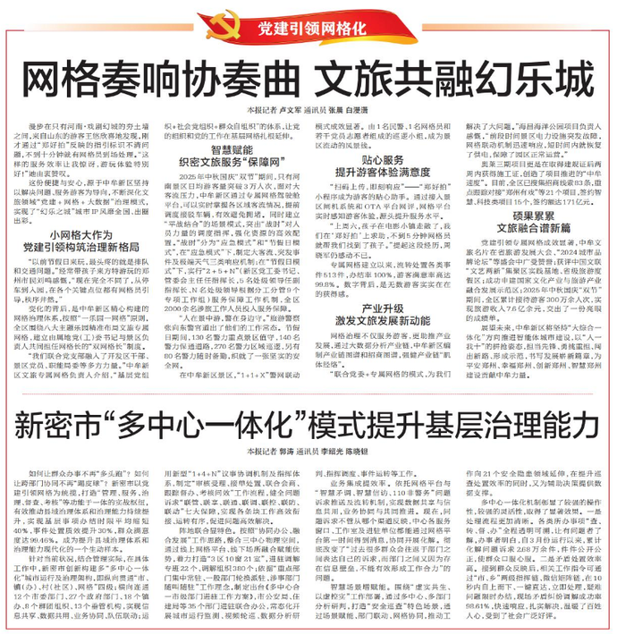 如何让群众办事不再“多头跑”?如何让跨部门协同不再“踢皮球”?新密市以党建引领网格为统揽,打造“管理、服务、治理、督查、考核”等功能于一体的实战枢纽,有效推动县域治理体系和治理能力持续提升,实现基层事项办结时限平均缩短40%,事件处置质效提升30%,群众满意度达99.46%。成为提升县域治理体系和治理能力现代化的一个生动样本。(今日《郑州日报》7版)