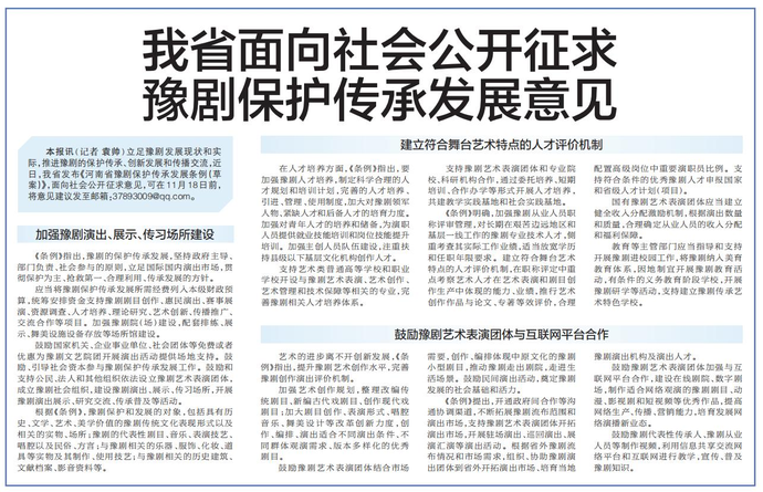 立足豫剧发展现状和实际,推进豫剧的保护传承、创新发展和传播交流,近日,我省发布《河南省豫剧保护传承发展条例(草案)》,面向社会公开征求意见,可在11月18日前,将意见建议发至邮箱:37893009@qq.com。(今日《郑州日报》8版)