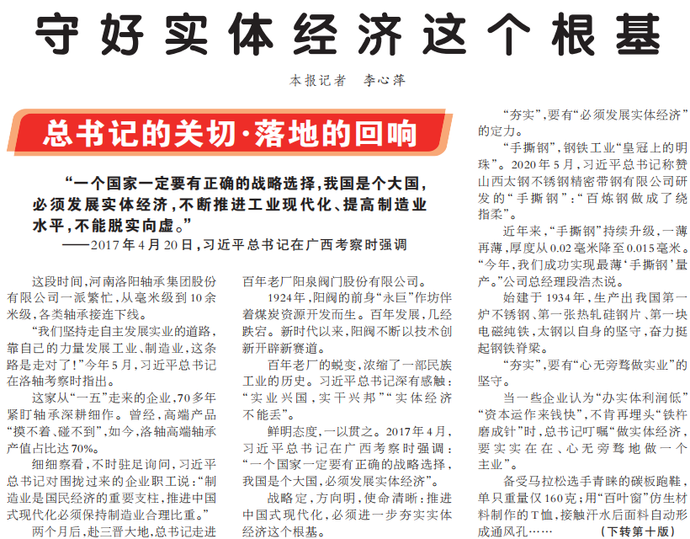 “我们坚持走自主发展实业的道路,靠自己的力量发展工业、制造业,这条路是走对了!”今年5月,习近平总书记在洛轴考察时指出。(今日《人民日报》1版、10版)