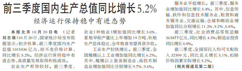 10月20日,国家统计局发布数据显示:初步核算,前三季度国内生产总值1015036亿元,按不变价格计算,同比增长5.2%。经济运行保持稳中有进态势,高质量发展取得积极成效。(今日《人民日报》1版、2版)