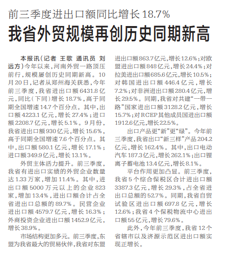 今年以来,河南外贸一路顶压前行,规模屡创历史同期新高。10月20日,记者从郑州海关获悉,今年前三季度,我省进出口额6431.8亿元,同比(下同)增长18.7%,高于同期全国增速14.7个百分点。其中,出口额4223.1亿元,增长27.4%;进口额2208.7亿元,增长5.1%。9月份,我省进出口额930亿元,增长15.6%,高于同期全国增速7.6个百分点。其中,出口额580.1亿元,增长17.1%;进口额349.9亿元,增长13.1%。(今日《河南日报》1版)
