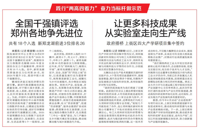 由国务院发展研究中心主管主办的《中国经济时报》近日发布“2025年全国千强镇研究成果”,根据综合实力指数排名揭晓2025年度全国综合实力千强镇榜单,郑州市共有18个入选。其中,新郑龙湖凭借强劲实力位列第26名,较2024年提升3位,稳居中部六省千强镇首位。(今日《郑州日报》1版)