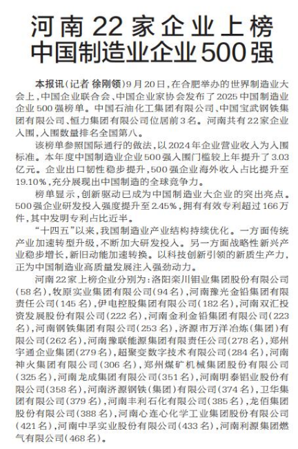 9月20日,在合肥举办的世界制造业大会上,中国企业联合会、中国企业家协会发布了2025中国制造业企业500强榜单。中国石油化工集团有限公司、中国宝武钢铁集团有限公司、恒力集团有限公司位居前3名。河南共有22家企业入围,入围数量排名全国第八。(今日《郑州日报》1版)