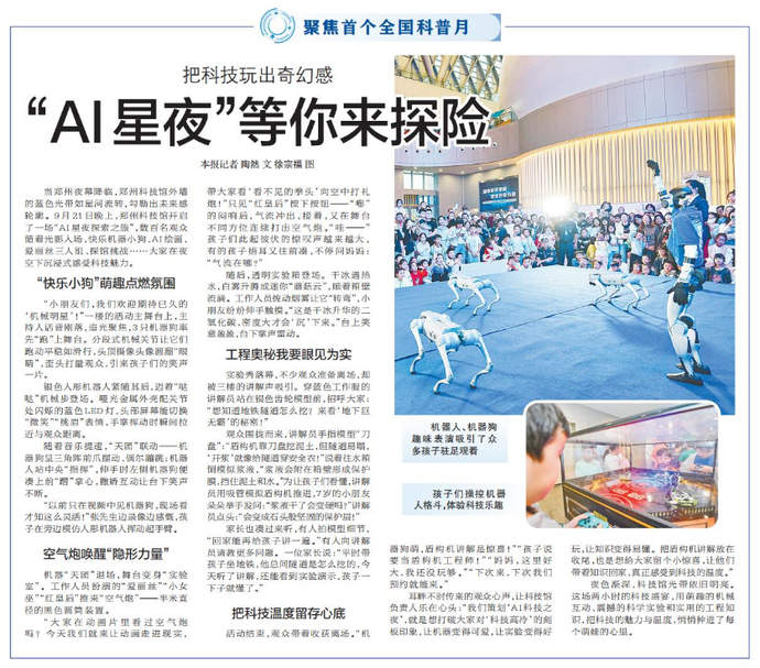 当郑州夜幕降临,郑州科技馆外墙的蓝色光带如星河流转,勾勒出未来感轮廓。9月21日晚上,郑州科技馆开启了一场“AI星夜探索之旅”,数百名观众循着光影入场,快乐机器小狗、AI绘画、爱丽丝三人组、探馆挑战……大家在夜空下沉浸式感受科技魅力。(今日《郑州日报》2版)