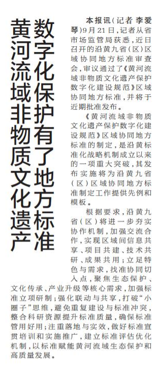 9月21日,记者从省市场监管局获悉,近日召开的沿黄九省(区)区域协同地方标准审查会,审议通过了《黄河流域非物质文化遗产保护数字化建设规范》区域协同地方标准,并将于近期批准发布。(今日《郑州日报》2版)