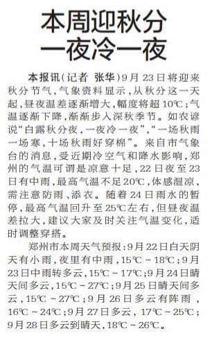 9月23日将迎来秋分节气,气象资料显示,从秋分这一天起,昼夜温差逐渐增大,幅度将超10℃;气温逐渐下降,渐渐步入深秋季节。如农谚说“白露秋分夜,一夜冷一夜”,“一场秋雨一场寒,十场秋雨好穿棉”。来自市气象台的消息,受近期冷空气和降水影响,郑州的气温可谓是凉意十足,22日夜至23日有中雨,最高气温不足20℃,体感湿凉,需注意防雨、添衣。随着24日雨水的暂停,最高气温回升至25℃左右,但昼夜温差拉大,建议大家及时关注气温变化,适时调整穿搭。(今日《郑州日报》2版)