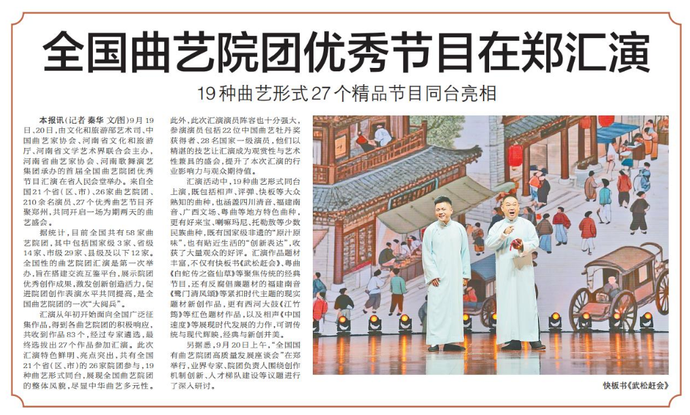 9月19日、20日,由文化和旅游部艺术司、中国曲艺家协会、河南省文化和旅游厅、河南省文学艺术界联合会主办,河南省曲艺家协会、河南歌舞演艺集团承办的首届全国曲艺院团优秀节目汇演在省人民会堂举办。来自全国21个省(区、市)、26家曲艺院团、210余名演员、27个优秀曲艺节目齐聚郑州,共同开启一场为期两天的曲艺盛会。(今日《郑州日报》6版)