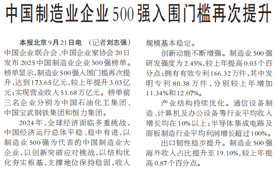 中国企业联合会、中国企业家协会20日发布2025中国制造业企业500强榜单。榜单显示,制造业500强入围门槛再次提升,达到173.65亿元,较上年提升3.03亿元;实现营业收入51.68万亿元。榜单前三名企业分别为中国石油化工集团、中国宝武钢铁集团和恒力集团。(今日《人民日报》1版)