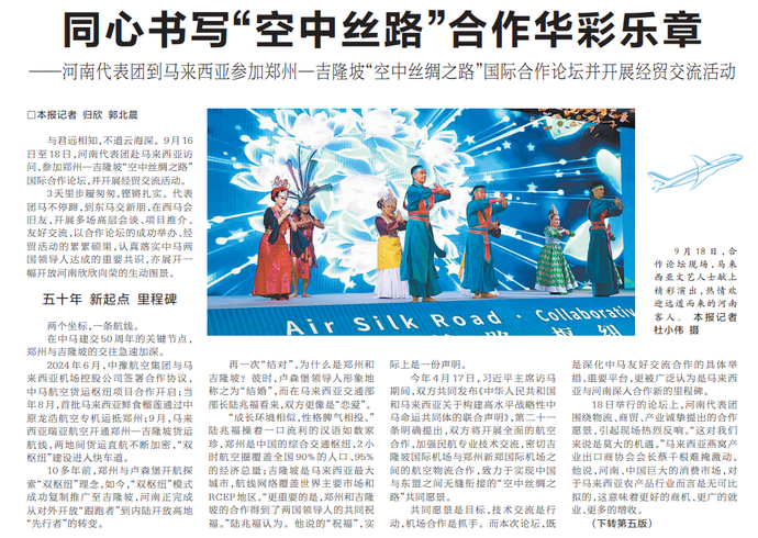 与君远相知,不道云海深。9月16日至18日,河南代表团赴马来西亚访问,参加郑州—吉隆坡“空中丝绸之路”国际合作论坛,并开展经贸交流活动。(今日《河南日报》1版、5版)