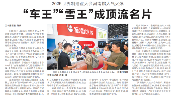 9月20日,2025世界制造业大会在安徽省合肥市开幕。河南作为主宾省参会参展,场馆内宇通智能巴士、超聚变AI服务器、汉威科技人机交互手套、蜜雪冰城等吸引众多参观者打卡,展示了河南制造的新形象。(今日《河南日报》2版)