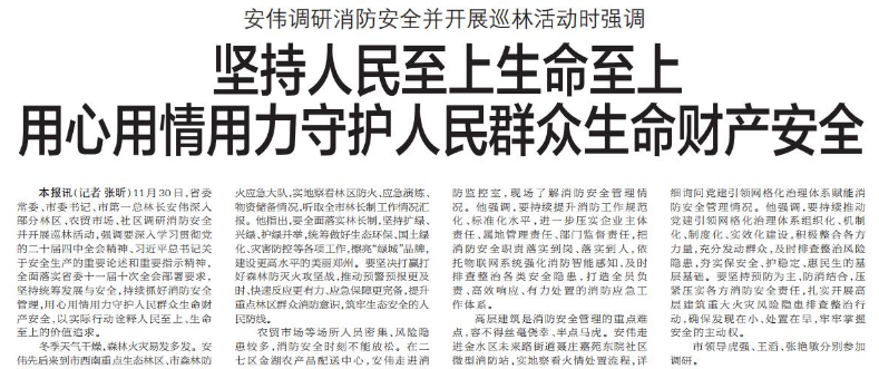 11月30日,省委常委、市委书记、市第一总林长安伟深入部分林区、农贸市场、社区调研消防安全并开展巡林活动,强调要深入学习贯彻党的二十届四中全会精神、习近平总书记关于安全生产的重要论述和重要指示精神,全面落实省委十一届十次全会部署要求,坚持统筹发展与安全,持续抓好消防安全管理,用心用情用力守护人民群众生命财产安全,以实际行动诠释人民至上、生命至上的价值追求。(今日《郑州日报》1版)
