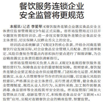 《餐饮服务连锁企业落实食品安全主体责任监督管理规定》今起正式实施。省市场监管局近日召开专题宣传贯彻培训会,进一步压实餐饮服务连锁企业食品安全主体责任,切实保障人民群众舌尖上的安全。(今日《郑州日报》2版)