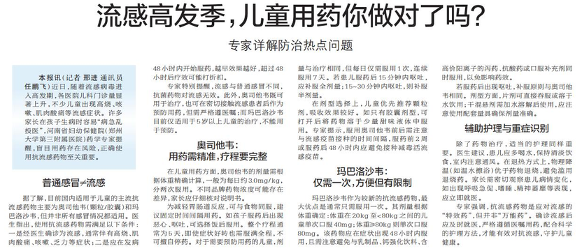 近日,随着流感病毒进入高发期,各医院儿科门诊量显著上升,不少儿童出现高烧、咳嗽、肌肉酸痛等流感症状。许多家长在孩子生病时容易“病急乱投医”,河南省妇幼保健院(郑州大学第三附属医院)药学专家提醒,盲目用药存在风险,正确使用抗流感药物至关重要。(今日《郑州日报》2版)