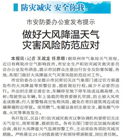 据郑州市气象局天气预报,近日有两轮冷空气影响我市,市安全生产和防灾减灾救灾委员会办公室发布消息,提示市民群众注意出行安全及防寒保暖,各地、各部门做好大风降温天气灾害风险防范应对工作。(今日《郑州日报》2版)