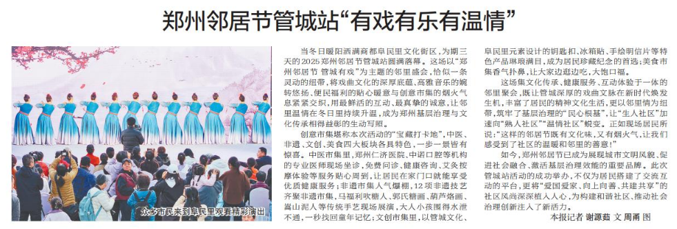 当冬日暖阳洒满商都阜民里文化街区,为期三天的2025郑州邻居节管城站圆满落幕。这场以“郑州邻居节 管城有戏”为主题的邻里盛会,恰似一条灵动的纽带,将戏曲文化的深厚底蕴、高雅音乐的婉转悠扬、便民福利的贴心暖意与创意市集的烟火气息紧紧交织,用最鲜活的互动、最真挚的诚意,让邻里温情在冬日里持续升温,成为郑州基层治理与文化传承相得益彰的生动写照。(今日《郑州日报》5版)