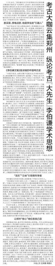 11月29日,“李伯谦先生学术思想研讨及《李伯谦文集》新书发布会”在郑举行,活动中,来自全国各大高校和相关单位的40多位专家学者和主办方代表围绕李伯谦先生的学术思想进行研讨,畅谈《李伯谦文集》的学术价值、文化价值和出版价值。在众人的描绘中,“李伯谦”不只是一位享誉全国的考古泰斗,更是深刻影响着一代代考古学者的“考古教育家”,是极具前瞻性和超前眼光的学术大家,在60多年的考古教育、研究生涯中,见证了中国考古学的一路前行。(今日《郑州日报》6版)