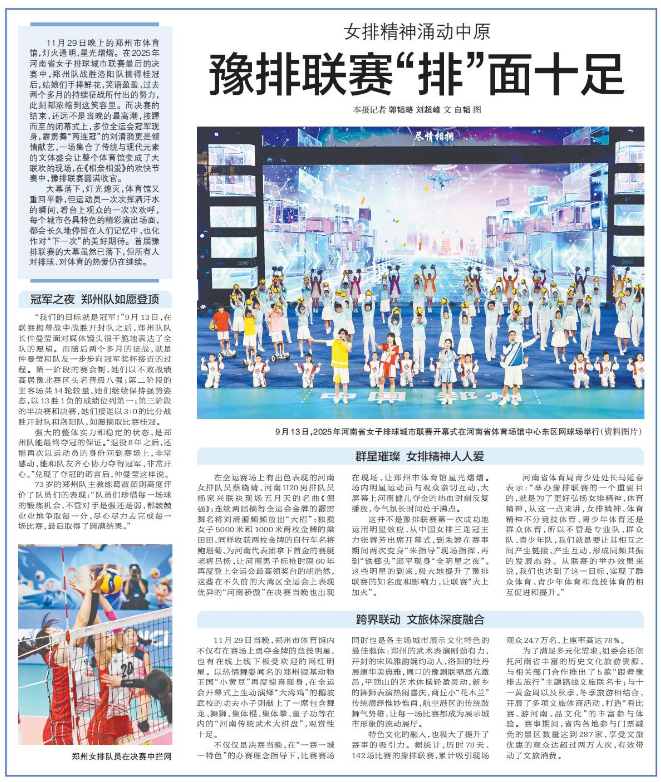 11月29日晚上的郑州市体育馆,灯火通明,星光熠熠。在2025年河南省女子排球城市联赛最后的决赛中,郑州队战胜洛阳队摘得桂冠后,姑娘们手捧鲜花,笑语盈盈,过去两个多月的持续征战所付出的努力,此刻都浓缩到这笑容里。而决赛的结束,还远不是当晚的最高潮,接踵而至的闭幕式上,多位全运会冠军现身,霹雳舞“两连冠”的刘清漪更是倾情献艺,一场集合了传统与现代元素的文体盛会让整个体育馆变成了大联欢的现场,在《相亲相爱》的欢快节奏中,豫排联赛圆满收官。(今日《郑州日报》6版)