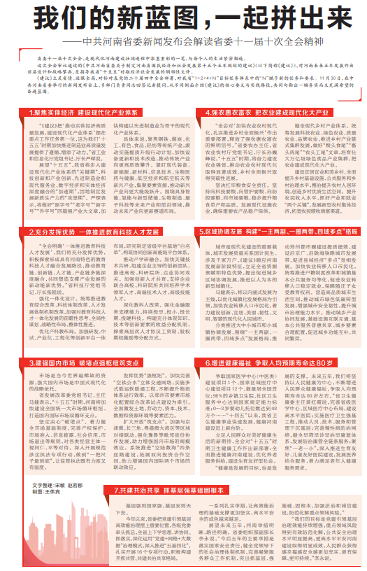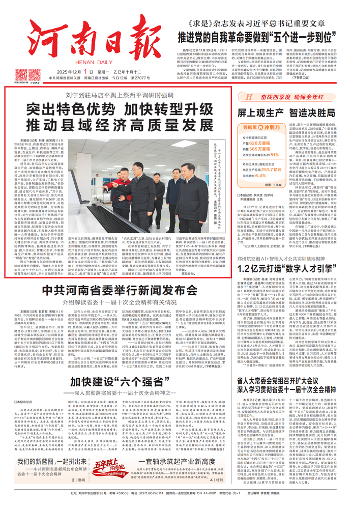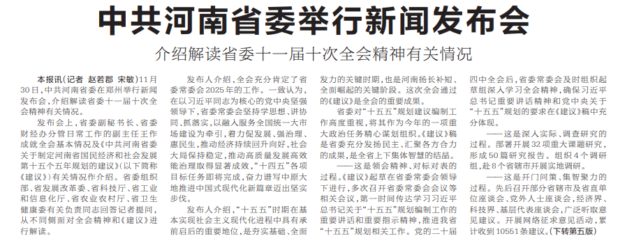 省委十一届十次全会11月28日至29日在郑州举行,审议通过了《中共河南省委关于制定河南省国民经济和社会发展第十五个五年规划的建议》,确立了“十五五”期间河南经济社会发展蓝图。11月30日,中共河南省委举行新闻发布会,介绍解读省委十一届十次全会精神有关情况。(今日《郑州日报》1版、2版)