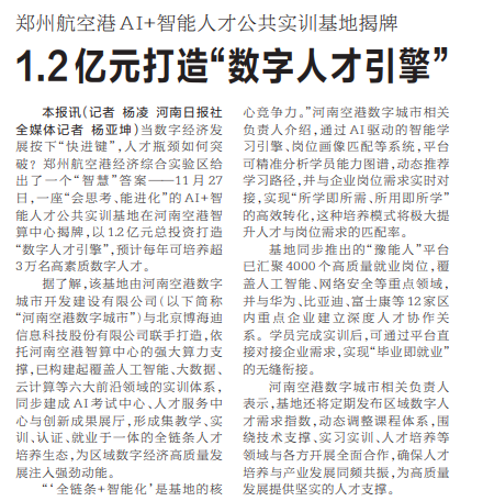 当数字经济发展按下“快进键”,人才瓶颈如何突破?郑州航空港经济综合实验区给出了一个“智慧”答案——11月27日,一座“会思考、能进化”的AI+智能人才公共实训基地在河南空港智算中心揭牌,以1.2亿元总投资打造“数字人才引擎”,预计每年可培养超3万名高素质数字人才。(今日《河南日报》1版)