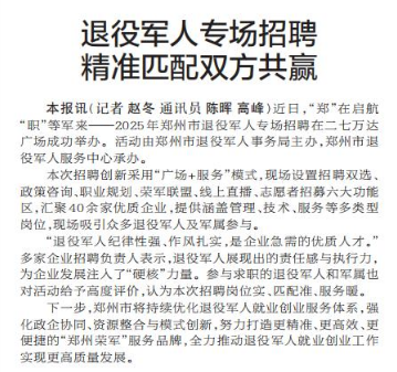 近日,“郑”在启航 “职”等军来——2025年郑州市退役军人专场招聘在二七万达广场成功举办。活动由郑州市退役军人事务局主办,郑州市退役军人服务中心承办。(今日《郑州日报》2版)