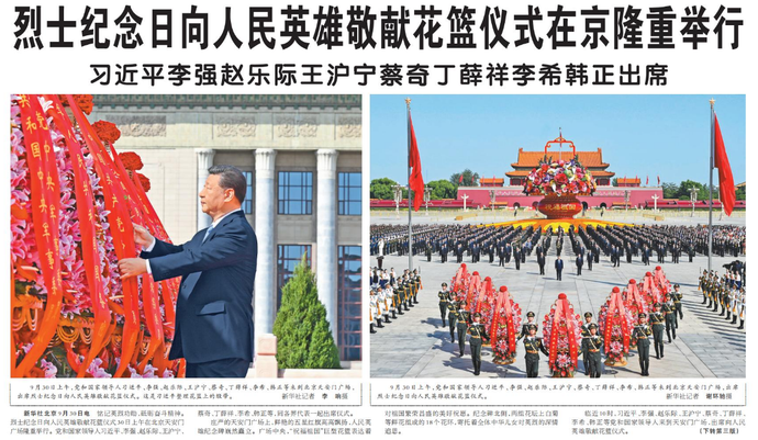 铭记英烈功勋,砥砺奋斗精神。烈士纪念日向人民英雄敬献花篮仪式30日上午在北京天安门广场隆重举行。党和国家领导人习近平、李强、赵乐际、王沪宁、蔡奇、丁薛祥、李希、韩正等,同各界代表一起出席仪式。(今日《人民日报》1版、3版)