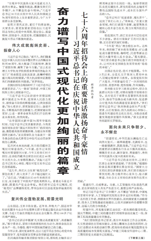 ——习近平总书记在庆祝中华人民共和国成立七十六周年招待会上的重要讲话激扬奋斗豪情
