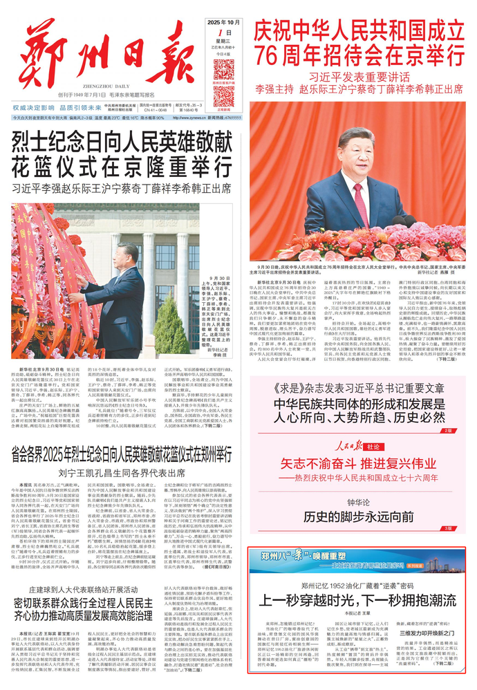 英名垂万古,正气满乾坤。今年是中国人民抗日战争暨世界反法西斯战争胜利80周年,9月30日是国家设立的烈士纪念日,习近平等党和国家领导人同各界代表一起,在天安门广场向人民英雄敬献花篮。在郑州烈士陵园,省会各界也举行了2025年烈士纪念日向人民英雄敬献花篮仪式。省委书记刘宁、省长王凯、省政协主席孔昌生等省(军)级领导,同省会各界代表一起缅怀先烈功勋,弘扬伟大精神。(今日《人民日报》2版)