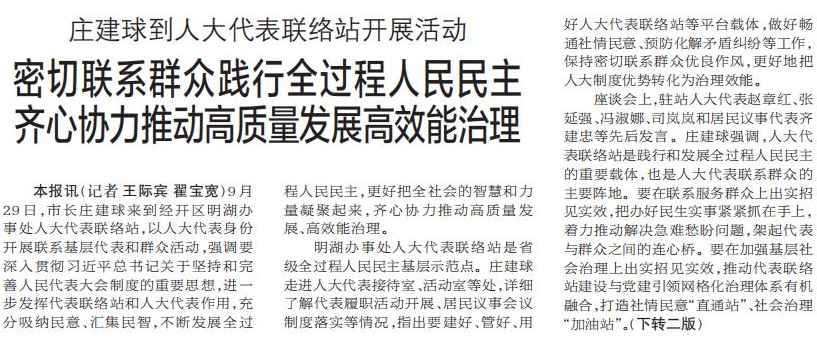 9月29日,市长庄建球来到经开区明湖办事处人大代表联络站,以人大代表身份开展联系基层代表和群众活动,强调要深入贯彻习近平总书记关于坚持和完善人民代表大会制度的重要思想,进一步发挥代表联络站和人大代表作用,充分吸纳民意、汇集民智,不断发展全过程人民民主,更好把全社会的智慧和力量凝聚起来,齐心协力推动高质量发展、高效能治理。(今日《郑州日报》1版、2版)