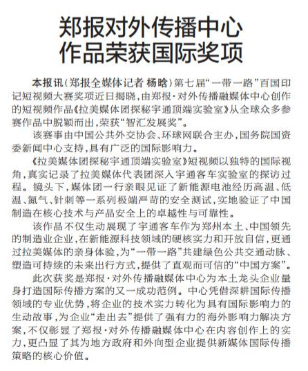 第七届“一带一路”百国印记短视频大赛奖项近日揭晓,由郑报·对外传播融媒体中心创作的短视频作品《拉美媒体团探秘宇通顶端实验室》从全球众多参赛作品中脱颖而出,荣获“智汇发展奖”。(今日《郑州日报》2版)