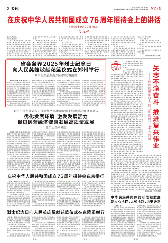 今天,我们欢聚一堂,共同庆祝中华人民共和国成立76周年。首先,我代表党中央和国务院,向全国各族人民,向中国人民解放军指战员和武警部队官兵,向各民主党派和无党派人士,致以节日祝贺!向香港特别行政区同胞、澳门特别行政区同胞、台湾同胞和海外侨胞,致以诚挚问候!向长期以来关心和支持中国建设事业的友好国家和国际友人,致以衷心感谢!(今日《人民日报》2版)