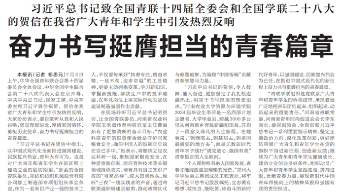 7月2日上午,中华全国青年联合会第十四届委员会全体会议、中华全国学生联合会第二十八次代表大会在京开幕。中共中央总书记、国家主席、中央军委主席习近平致信祝贺。贺信在我省广大青年和学生中引发热烈反响,大家纷纷表示,要自觉听从党和人民召唤,坚定理想信念,厚植家国情怀,勇担历史使命,奋力书写挺膺担当的青春篇章。(今日《河南日报》2版)