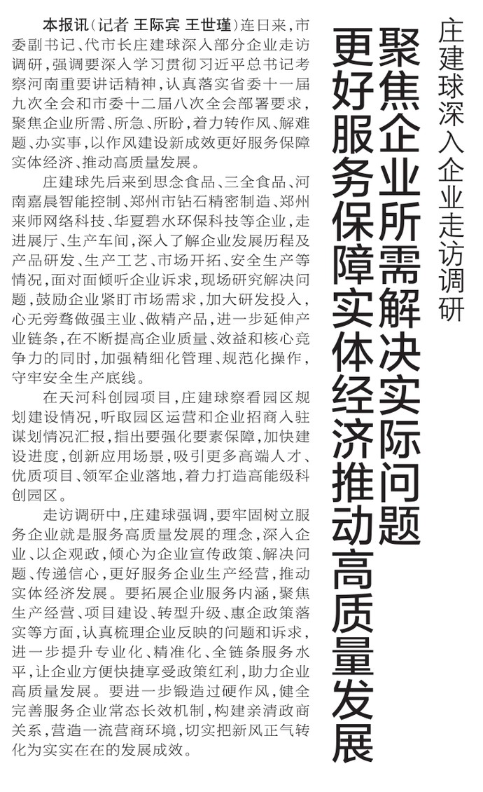 连日来,市委副书记、代市长庄建球深入部分企业走访调研,强调要深入学习贯彻习近平总书记考察河南重要讲话精神,认真落实省委十一届九次全会和市委十二届八次全会部署要求,聚焦企业所需、所急、所盼,着力转作风、解难题、办实事,以作风建设新成效更好服务保障实体经济、推动高质量发展。(今日《郑州日报》1版)