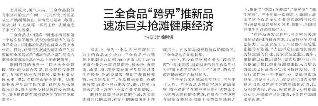三全食品“跨界”推新品 速冻巨头抢滩健康经济