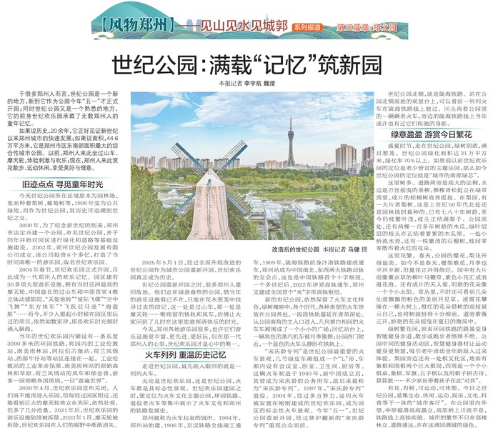 于很多郑州人而言,世纪公园是一个新的地方,新到它作为公园今年“五一”才正式开园;同时世纪公园又是一个熟悉的地方,它的前身世纪欢乐园承载了无数郑州人的童年记忆。(今日《郑州日报》3版)