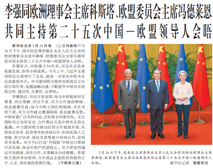 7月24日下午,国务院总理李强在北京人民大会堂同欧洲理事会主席科斯塔、欧盟委员会主席冯德莱恩共同主持第二十五次中国—欧盟领导人会晤。(今日《人民日报》1版、3版)