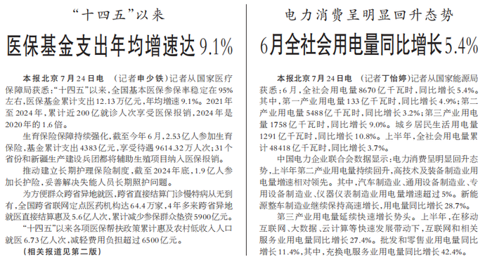 记者从国家医疗保障局获悉:“十四五”以来,全国基本医保参保率稳定在95%左右,医保基金累计支出12.13万亿元,年均增速9.1%。2021年至2024年,累计近200亿就诊人次享受医保报销,2024年是2020年的1.6倍。(今日《人民日报》1版、2版)