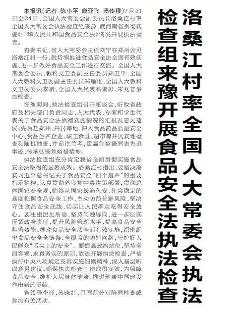 7月21日至24日,全国人大常委会副委员长洛桑江村率全国人大常委会执法检查组来豫,就河南省贯彻实施《中华人民共和国食品安全法》情况开展执法检查。(今日《河南日报》1版)
