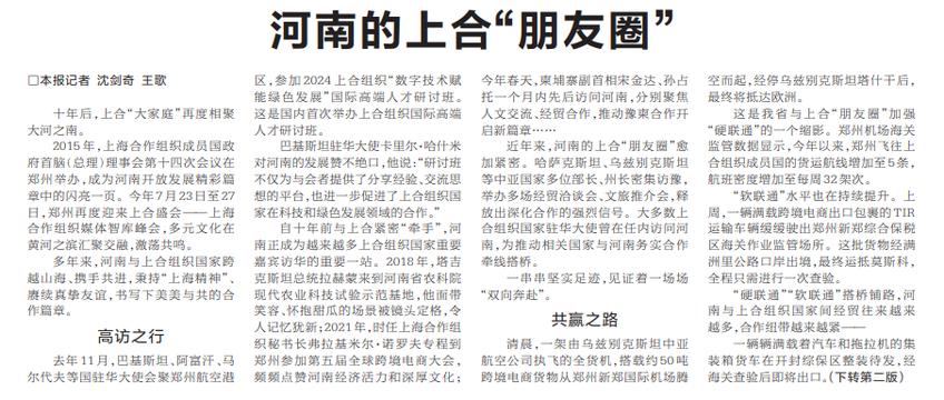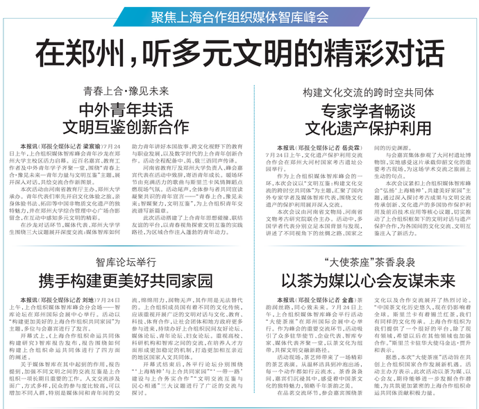 2015年,上海合作组织成员国政府首脑(总理)理事会第十四次会议在郑州举办,成为河南开放发展精彩篇章中的闪亮一页。今年7月23日至27日,郑州再度迎来上合盛会——上海合作组织媒体智库峰会,多元文化在黄河之滨汇聚交融,激荡共鸣。(今日《河南日报》1版、2版)