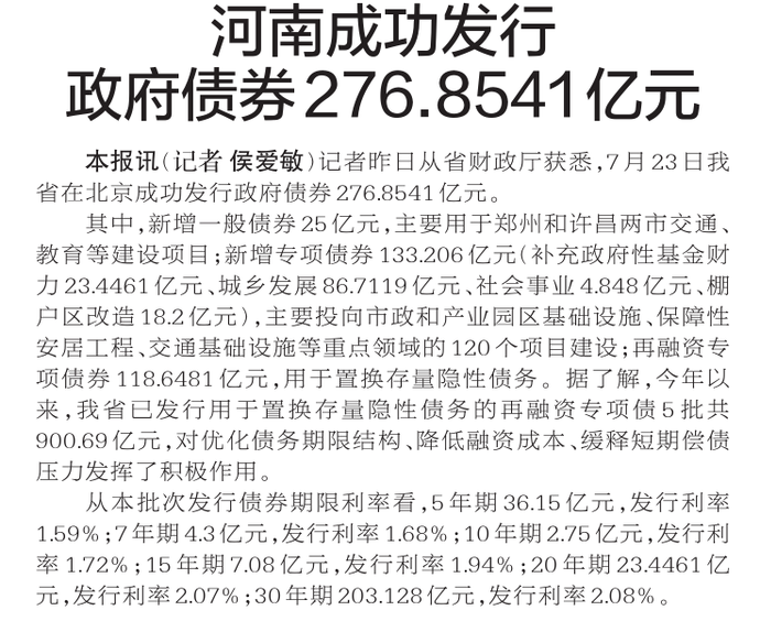 记者昨日从省财政厅获悉,7月23日我省在北京成功发行政府债券276.8541亿元。(今日《郑州日报》1版)