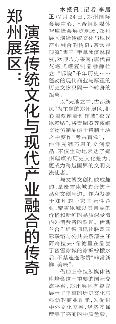 7月24日,郑州国际会展中心,上合组织媒体智库峰会展览现场,郑州展区演绎传统文化与现代产业融合的传奇:茶饮界顶流“雪王”手拿冰淇淋权杖,欢迎八方来客;唐代青花塔式罐复制品静静伫立,“诉说”千年历史……蓬勃的现代商业与厚重的历史文脉只隔一个转身的距离。(今日《郑州日报》2版)