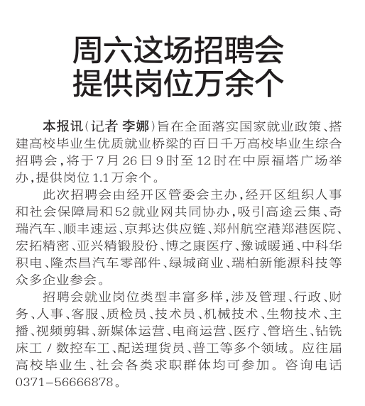 旨在全面落实国家就业政策、搭建高校毕业生优质就业桥梁的百日千万高校毕业生综合招聘会,将于7月26日9时至12时在中原福塔广场举办,提供岗位1.1万余个。(今日《郑州日报》2版)
